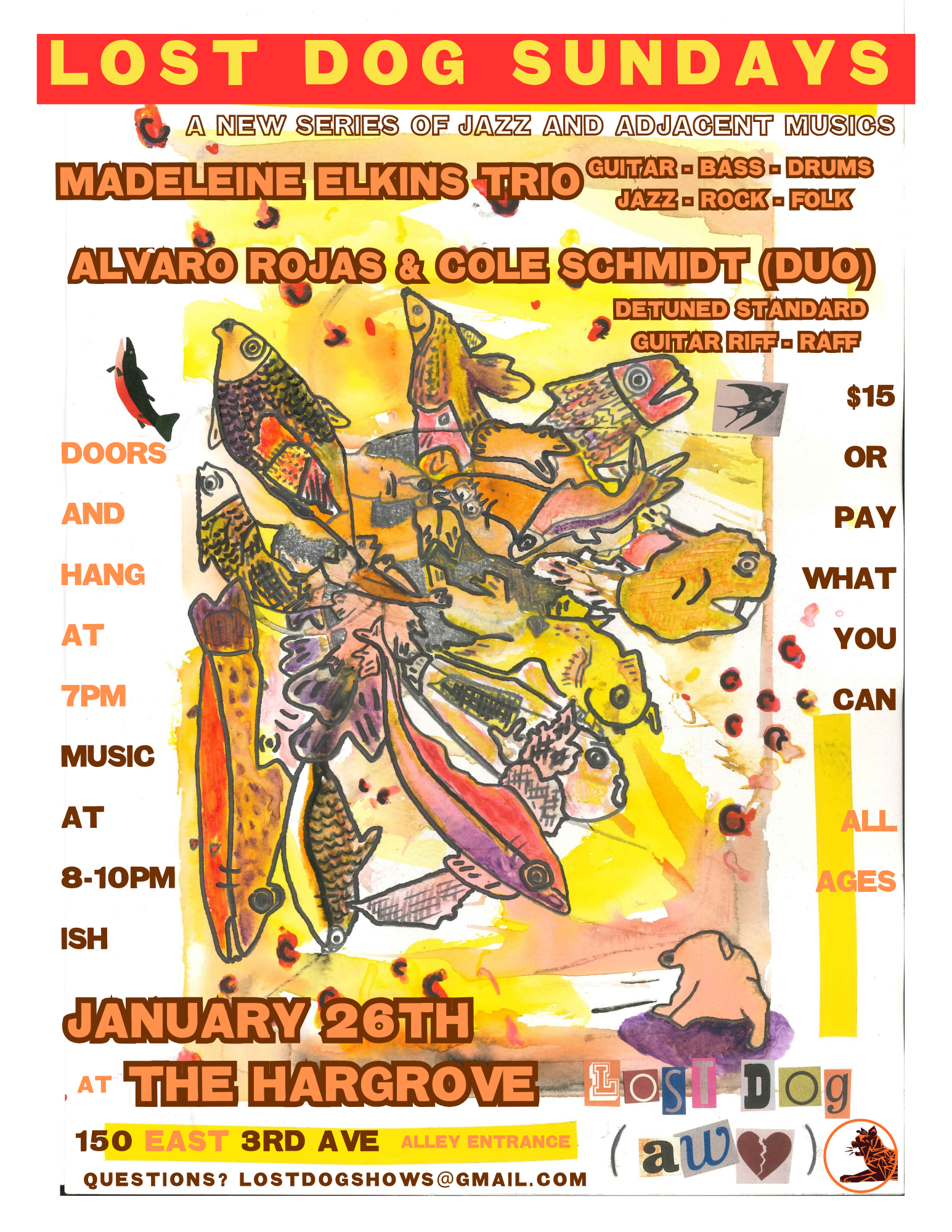 On Sunday, January 26, 2025 around 9pm at the Hargrove artist space, I joined guitarist Madeleine Elkins in her new trio with Kevin Romain on drums. The trio plays improvising-oriented, folk- and rock-influenced creative music. We inagurated a music series called Lost Dog Sundays, presented by the Barking Sphinx society, in the space at 150 East 3rd Avenue, Vancouver. Entrance is through the alley. Alvaro Rojas and Cole Schmidt's duo lined up first on the bill. Admission only at the door.